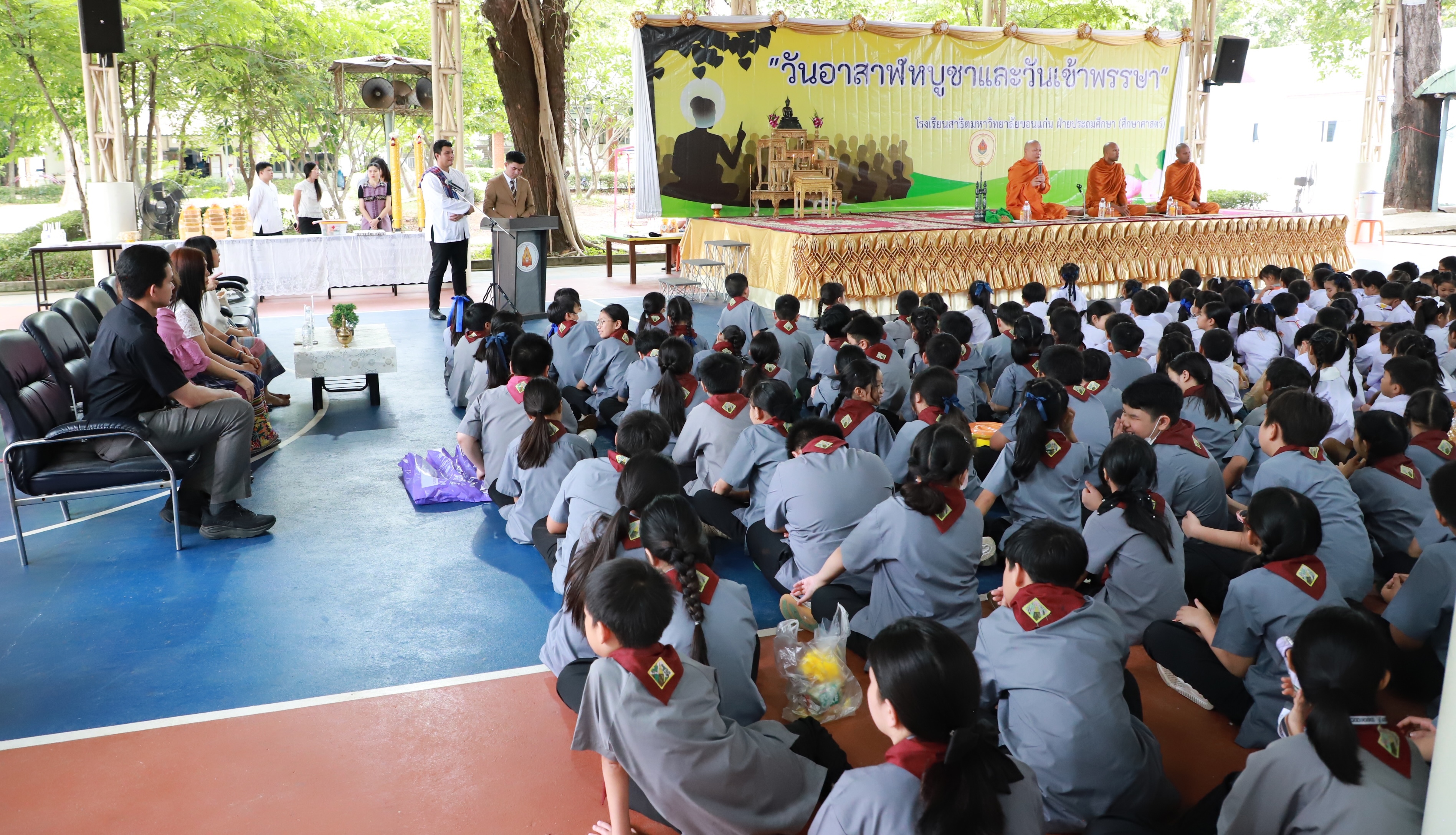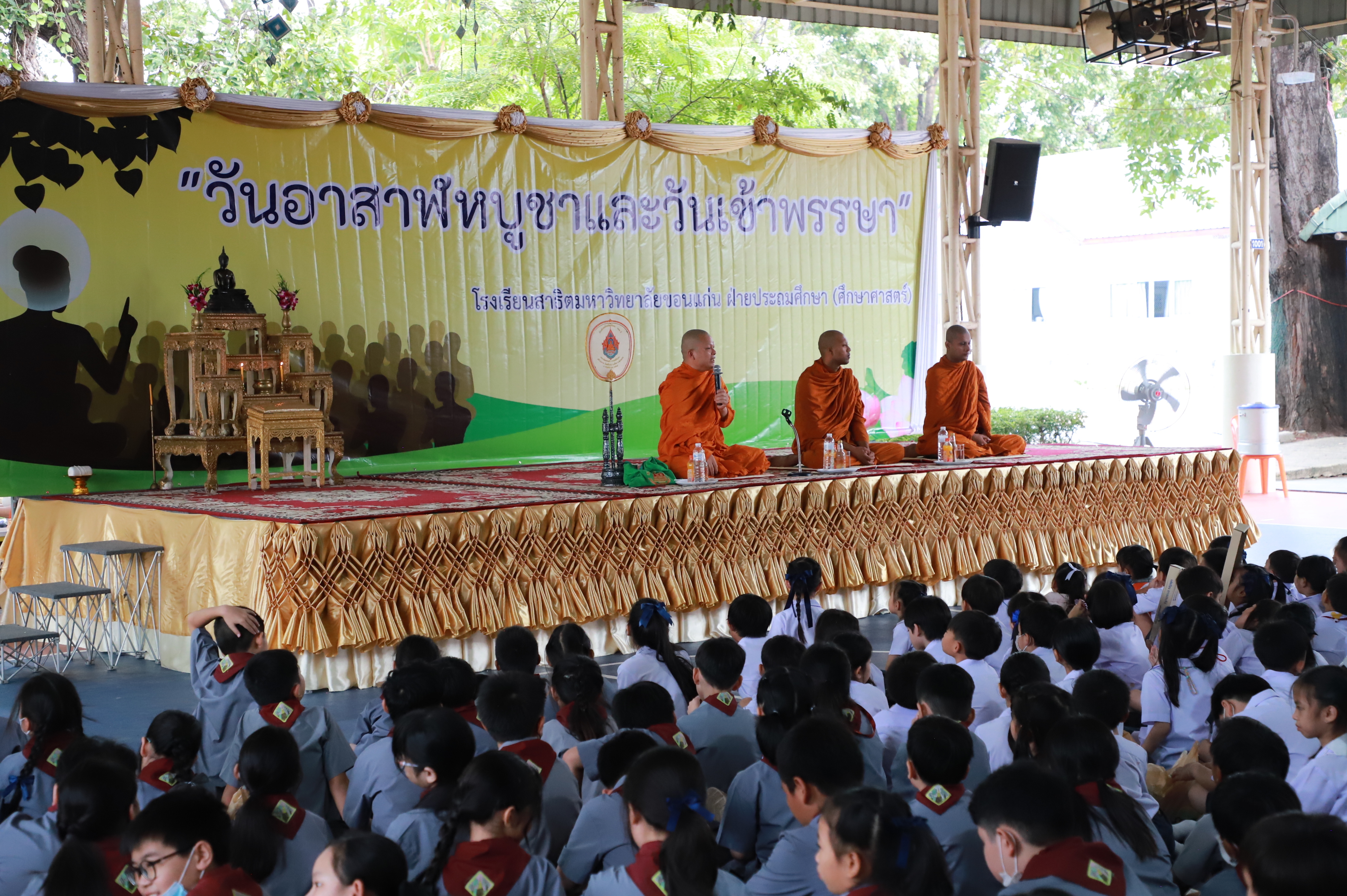 โรงเรียนสาธิตมหาวิทยาลัยขอนแก่น ฝ่ายประถมศึกษา (ศึกษาศาสตร์) จัดกิจกรรมวันอาสาฬหบูชาและวันเข้าพรรษา ในวันพุธที่ 9 กรกฎาคม 2568 เวลา 08.30 น. น. ณ อาคารอเนกประสงค์ ในการทำบุญในวันนี้พระอาจารย์ฮอนด้า วาทสทฺโท ผู้ช่วยเจ้าอาวาสวัดศรีนวล จังหวัดขอนแก่น แสดงพระธรรมเทศนาเนื่องในวันอาสาฬหบูชาและวันเข้าพรรษา อบรมนักเรียนให้เป็นผู้มีศีล เป็นลูกที่ดีของพ่อแม่ เป็นศิษย์ที่น่ารักของครู และในการนี้ อาจารย์ปิลันธนา สุภดล รองผู้อำนวยการโรงเรียน และคณะผู้บริหารถวายเทียนพรรษา คณาจารย์ และนักเรียนถวายเทียนพรรษา ผ้าอาบน้ำฝน สังฆทาน ชุดภัตตาหาร และเครื่องไทยธรรม โรงเรียนขออนุโมธนาบุญ และขอบคุณผู้ปกครองและผู้ที่มีส่วนเกี่ยวข้องทุกท่านที่ทำให้กิจกรรมบรรลุวัตถุประสงค์ทุกประการ