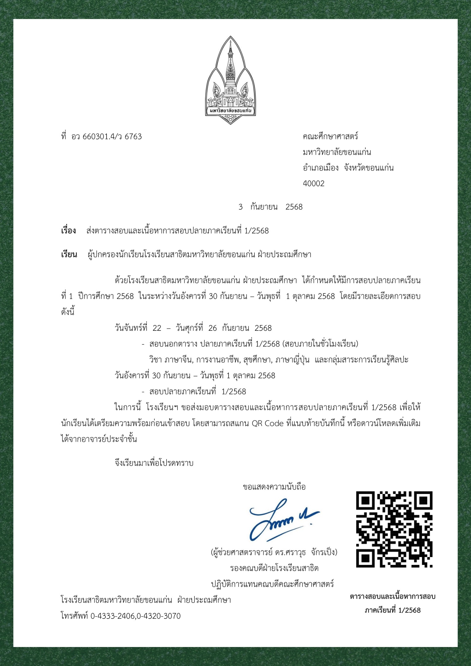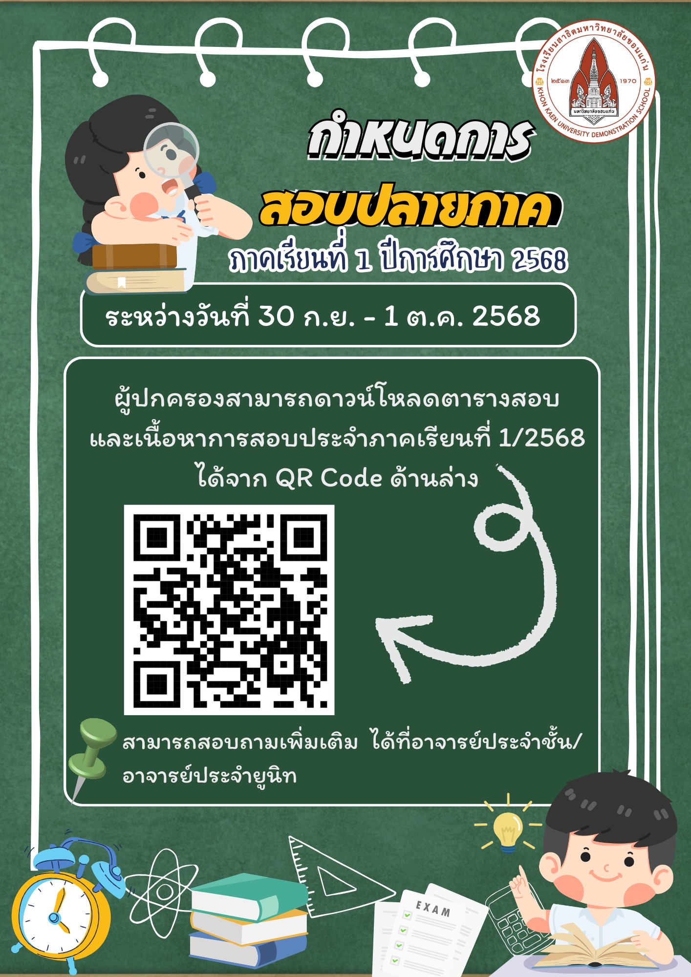 โรงเรียนสาธิตมหาวิทยาลัยขอนแก่น ฝ่ายประถมศึกษา กำหนดการสอบปลายภาคเรียนที่ 1 ปีการศึกษา 2568 สามารถศึกษารายละเอียดตามประกาศหรือ QR Code ที่แนบมาค่ะ