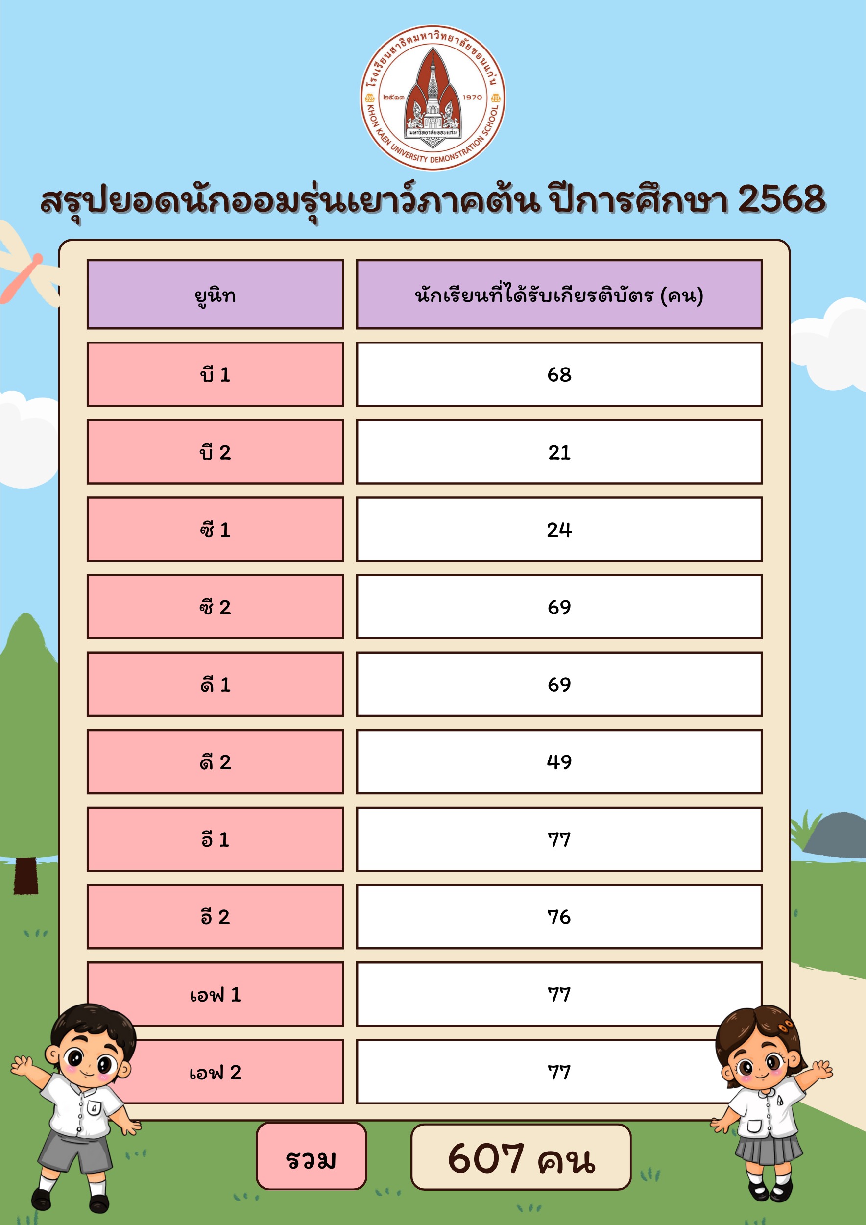 วันพฤหัสบดีที่ 2 ตุลาคม 2568 โรงเรียนสาธิตมหาวิทยาลัยขอนแก่น ฝ่ายประถมศึกษา (ศึกษาศาสตร์) จัดกิจกรรมมอบเกียรติบัตรนักออมรุ่นเยาว์ภาคต้น และเงินสนับสนุนกิจกรรมภายในยูนิท โดยมีนักออมรุ่นเยาว์ทั้งหมด 607 คน โดยมีตัวแทนนักเรียนยูนิทบี-เอฟ รับมอบเกียรติบัตรนักออมรุ่นเยาวฺ์ พร้อมเงินสนับสนุนกิจกรรมในยูนิทละ 1,000 บาท โดยมีอาจารย์ปิลันธนา ศุภดล รักษาการแทนรองผู้อำนวยการ เป็นผู้มอบและกล่าวให้โอวาทกับนักเรียน