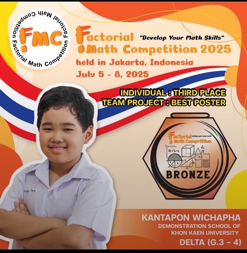 ขอแสดงความยินดีกับเด็กชายกันตภณ วิชาผา ยูนิทดี 1 โรงเรียนสาธิตมหาวิทยาลัยขอนแก่น ฝ่ายประถมศึกษา (ศึกษาศาสตร์ฺ) ที่ได้รับคัดเลือกให้เป็นตัวแทนประเทศไทย ในการเข้าร่วมการแข่งขันคณิตศาสตร์ระดับนานาชาติ รายการ Factorial Math Competition 2025 ณ กรุงจาการ์ตา ประเทศอินโดนิเซีย ระหว่างวันที่ 5-8 กรกฎาคม 2568 โดยรับรางชนะเลิศ Team Project: Best Poster รางวัลเหรียญทองแดง
