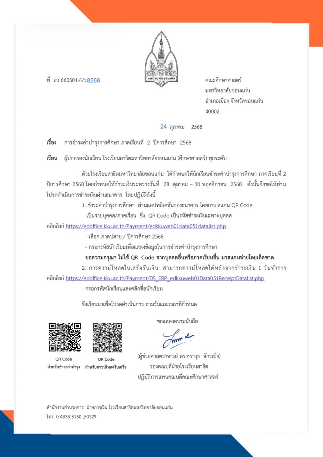 >>>การชำระเงินสามารถทำได้ผ่านระบบออนไลน์ โดยใช้ QR Code เฉพาะรายบุคคล หรือเข้าผ่านลิงก์ระบบชำระเงินของมหาวิทยาลัยขอนแก่น