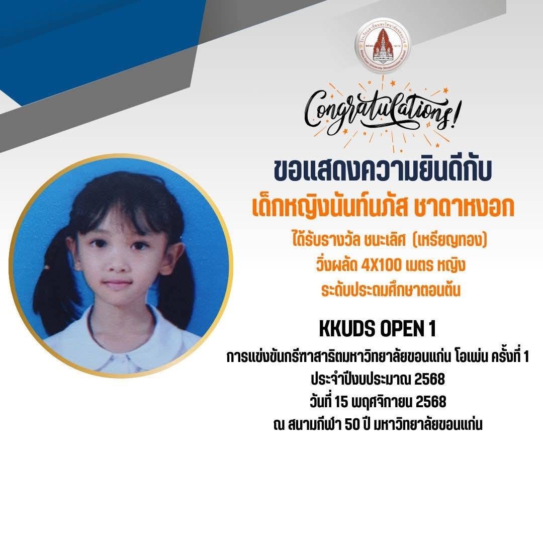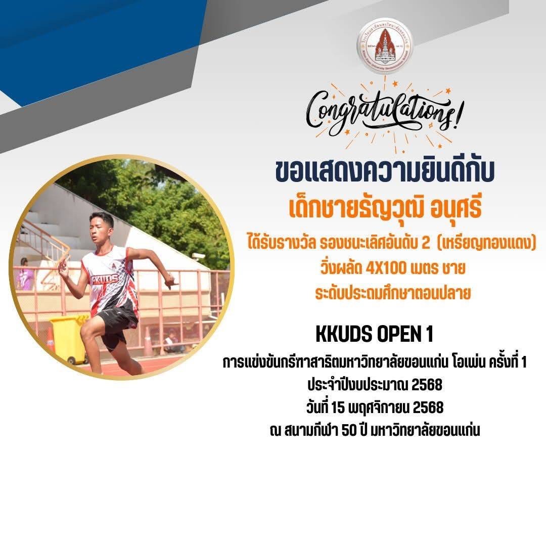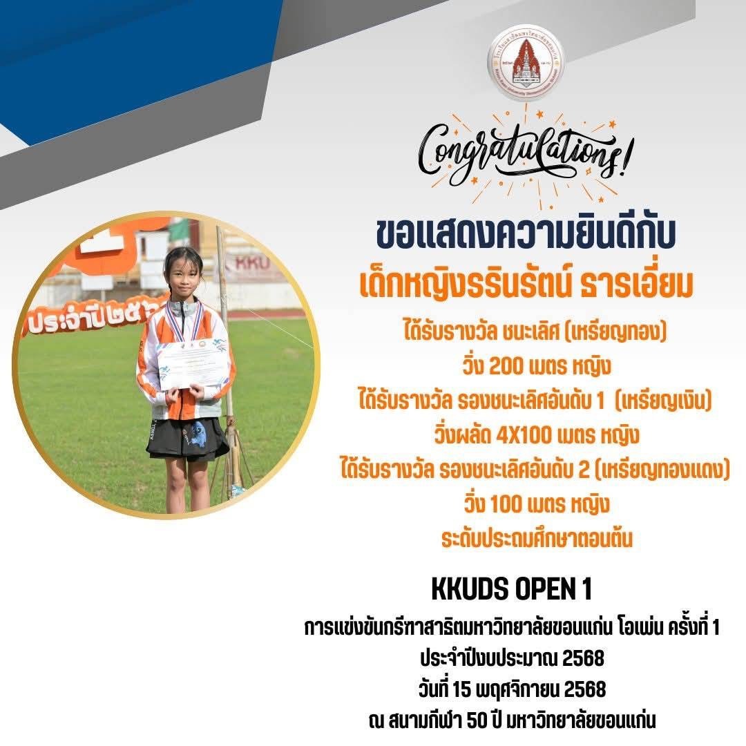 ผลรางวัลการแข่งขัน KKUDSOPEN1 การแข่งขันกรีทาสาธิตมหาวิทยาลัยขอนแก่น โอเพ่น ครั้งที่ 1 ประจำปีงบประมาณ 2568 ในวันที่ 15 พฤศจิกายน 2568 ที่ผ่านมา ณ สนามกีฬา 50 ปี มหาวิทยาลัยขอนแก่น โดยมีผลการแข่งขันตามภาพดังนี้