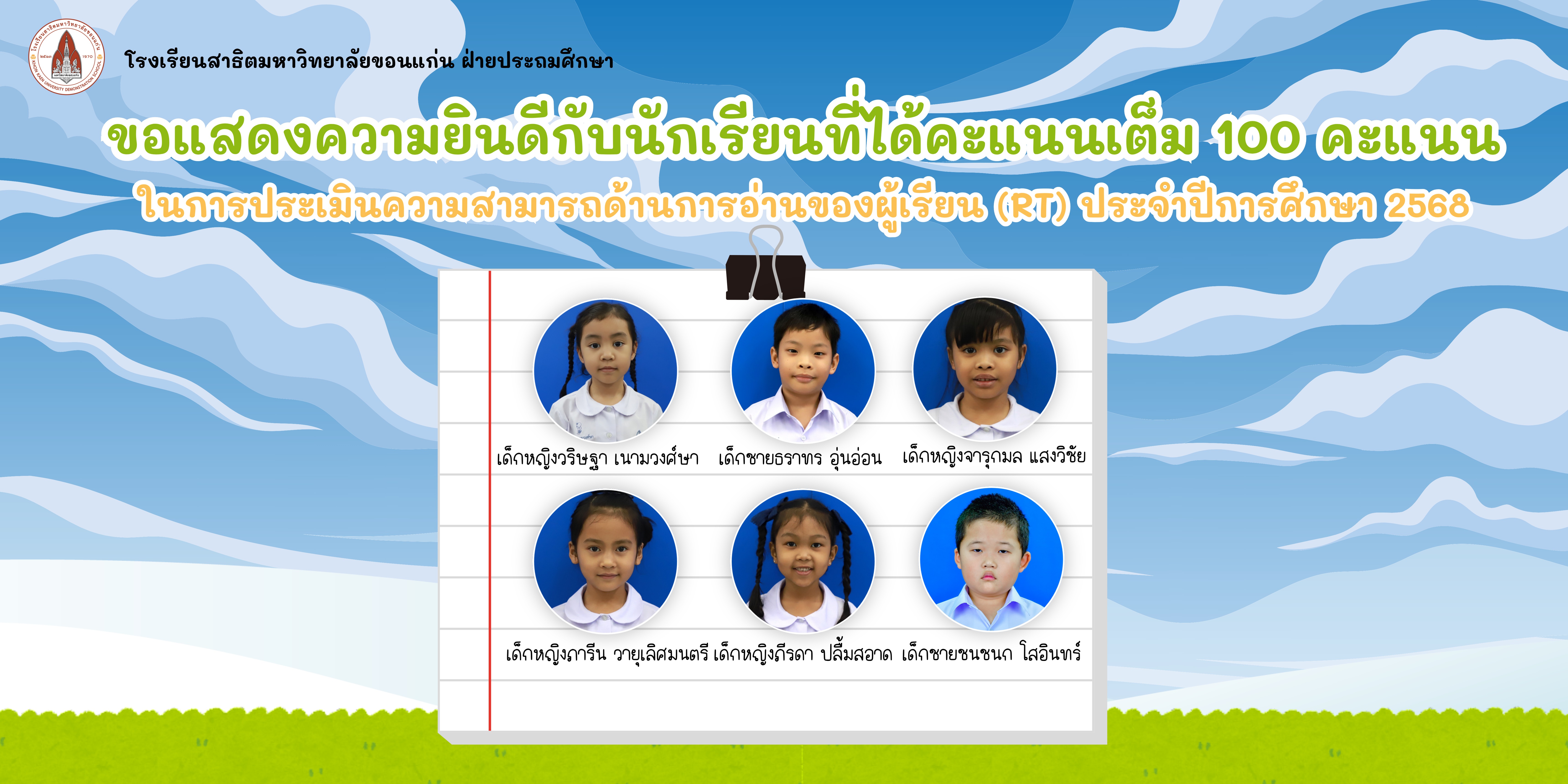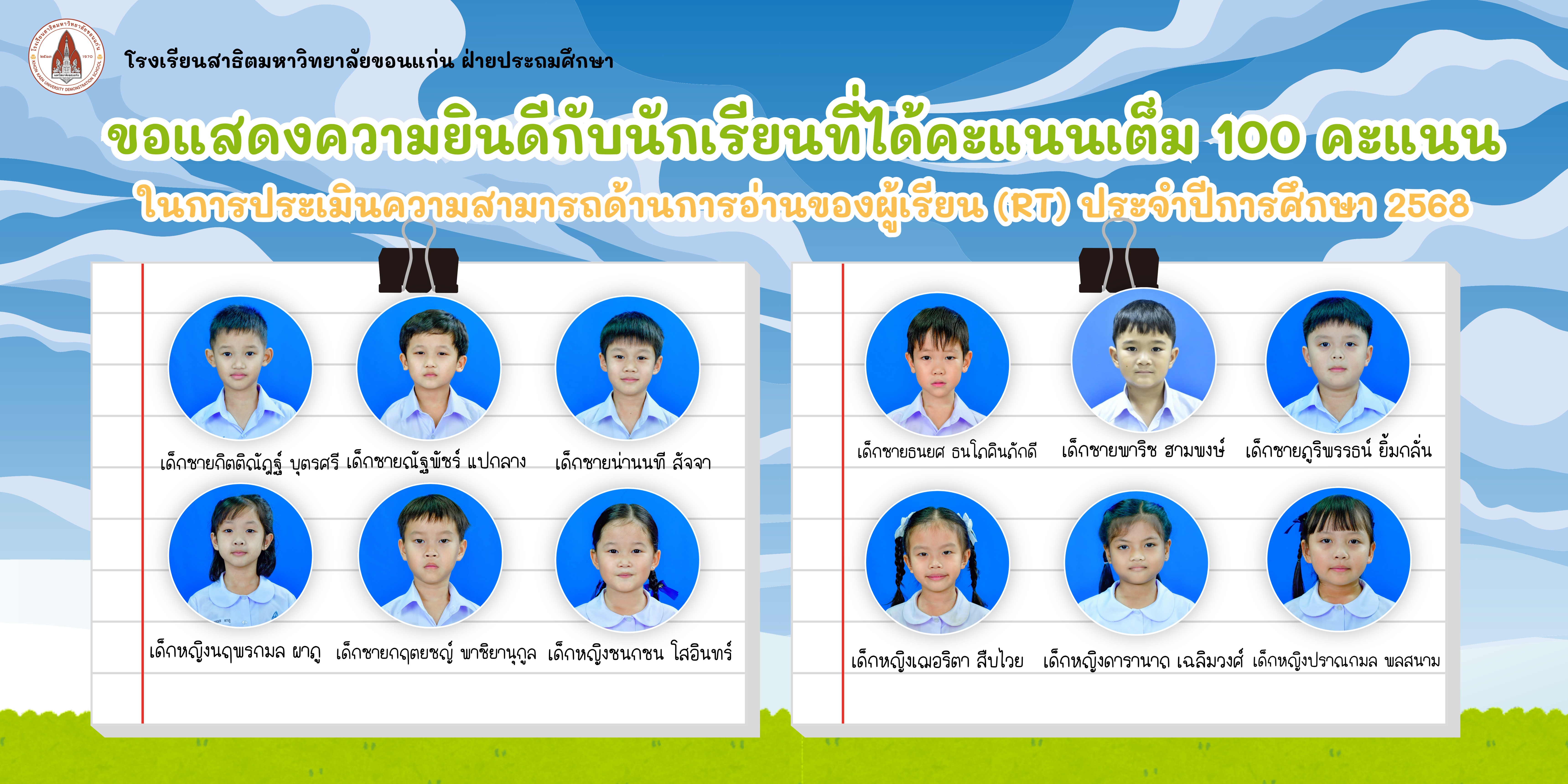 โรงเรียนสาธิตมหาวิทยาลัยขอนแก่น ฝ่ายประถมศึกษา ขอแสดงความยินดีกับนักเรียนชั้นประถมศึกษาปีที่ 1 ที่สอบได้คะแนนเต็ม 100 คะแนน ในการประเมินความสามารถด้านการอ่านของผู้เรียน (RT) ประจำปีการศึกษา 2568 โดยมีรายชื่อดังปรากฏ